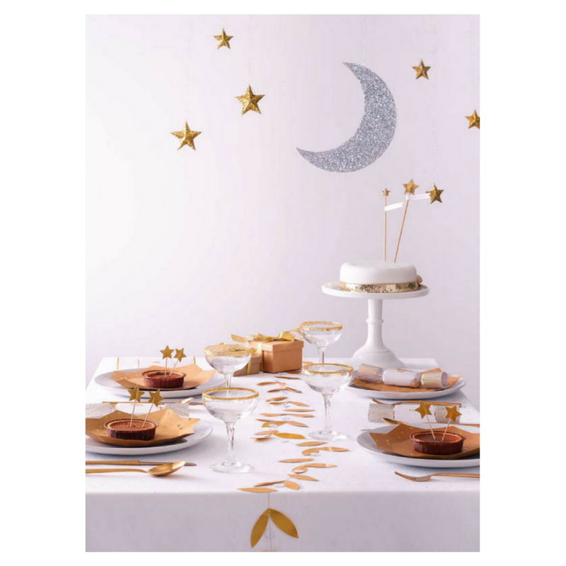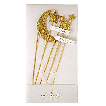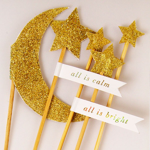 Decorate your festive bakes with these glittery gold cake toppers, featuring star and moon motifs with flag pennants declaring 'all is calm' and 'all is bright' from Silent Nighet. The toppers are embellished with gold glitter.