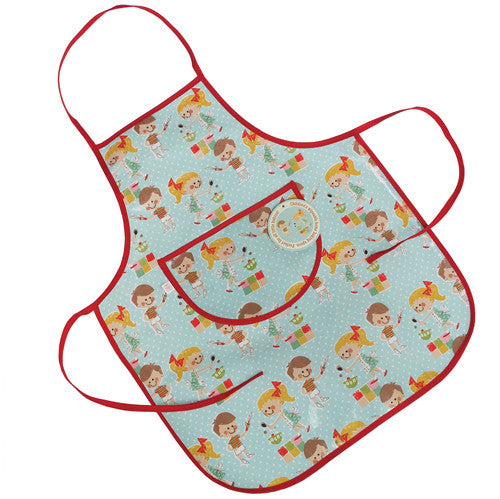 Child size wipe clean PVC kitchen apron with retro Home Baking design, handy front pocket and cotton ties.