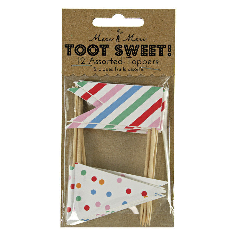 The cutest little cake flags or toppers in two styles, spotty or striped! Multicoloured so will go with anything or simply use to add a quick flash of colour or interest to a plain white cake or cupcake. Part of the gorgeous mix and match Toot Sweet range from Meri Meri.