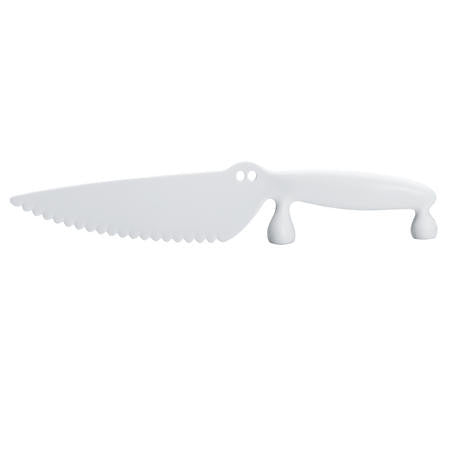 This is a fabulous and funky knife which is practical as well as stylish and fun. This durable plastic knife is safer than a metal knife but still cuts through cakes, pies, fruit, salad, etc with ease and without leaving a scratch on plates, pans or baking tins. Its design means it can stand on its feet when not in use.