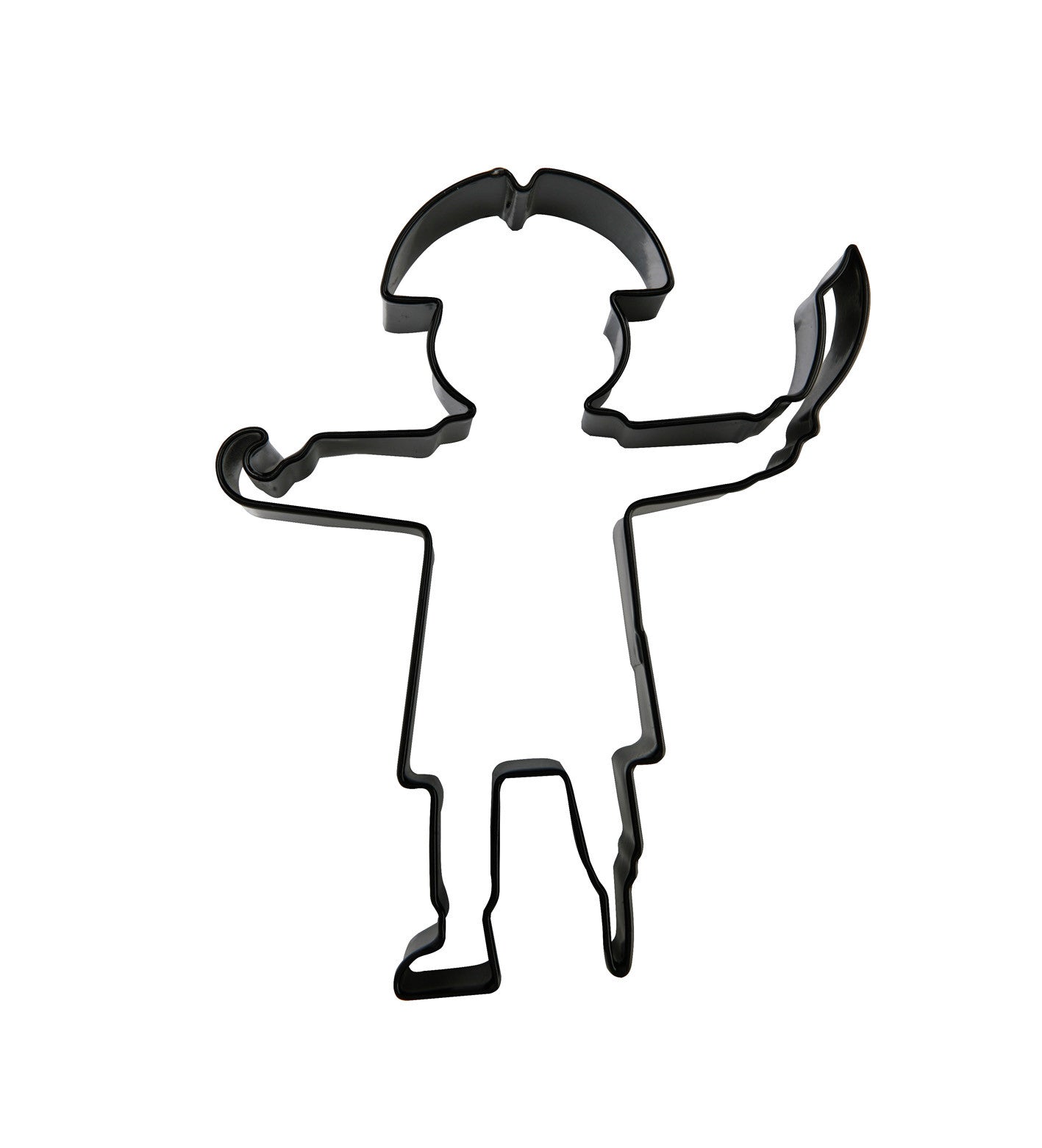 Pirate with sword cookie cutter in the style of Long John Silver. High quality black coated stainless steel.