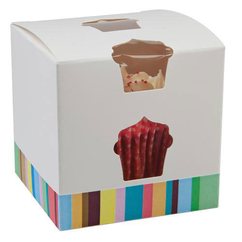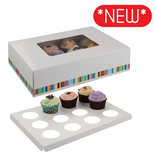 These cupcake boxes are designed to show off your creations to their best advantage with their window feature whilst keeping them secure. Clean, contemporary design: white with a edging of multicoloured stripes. Made in the UK. Boxes include inserts.