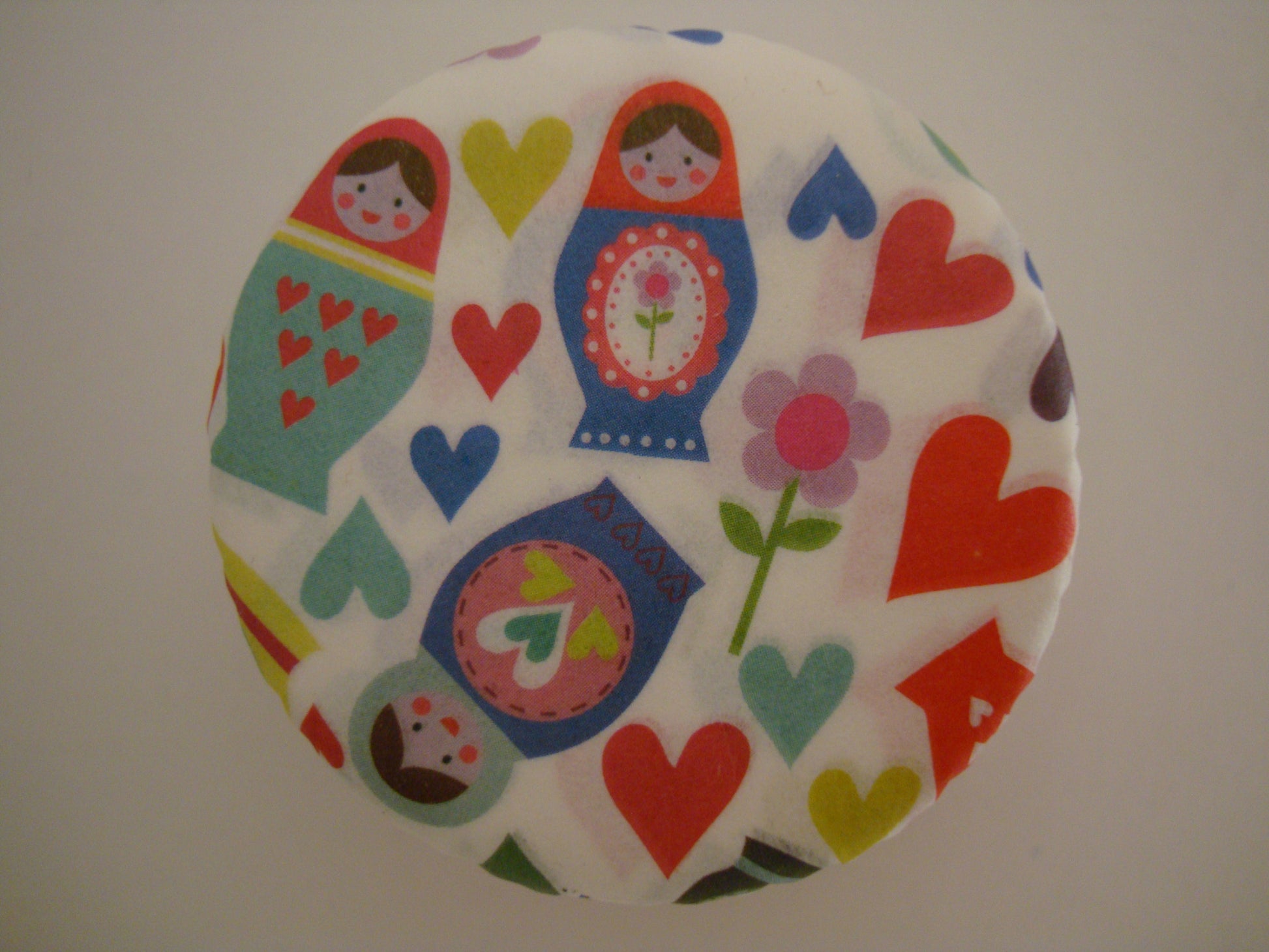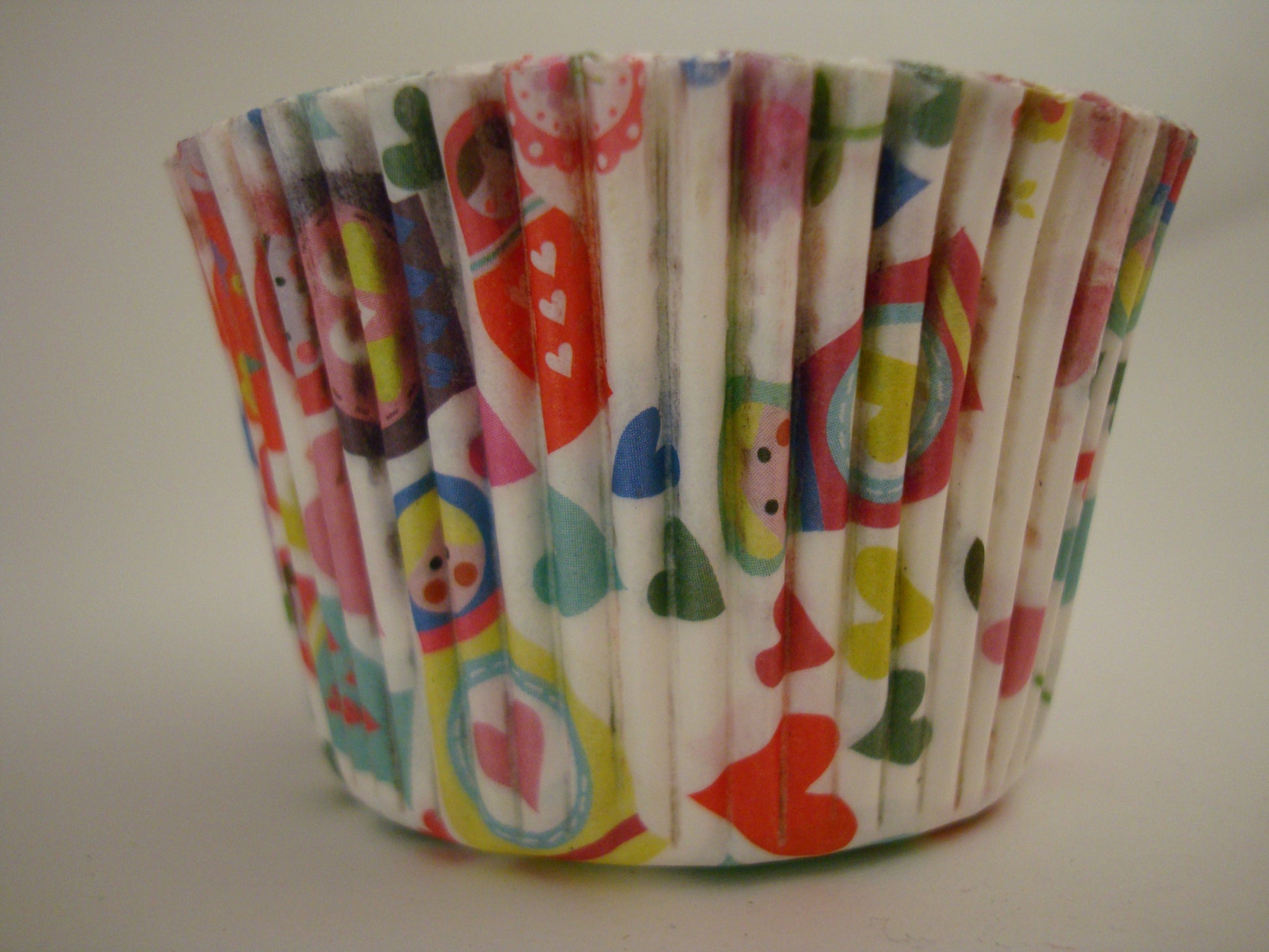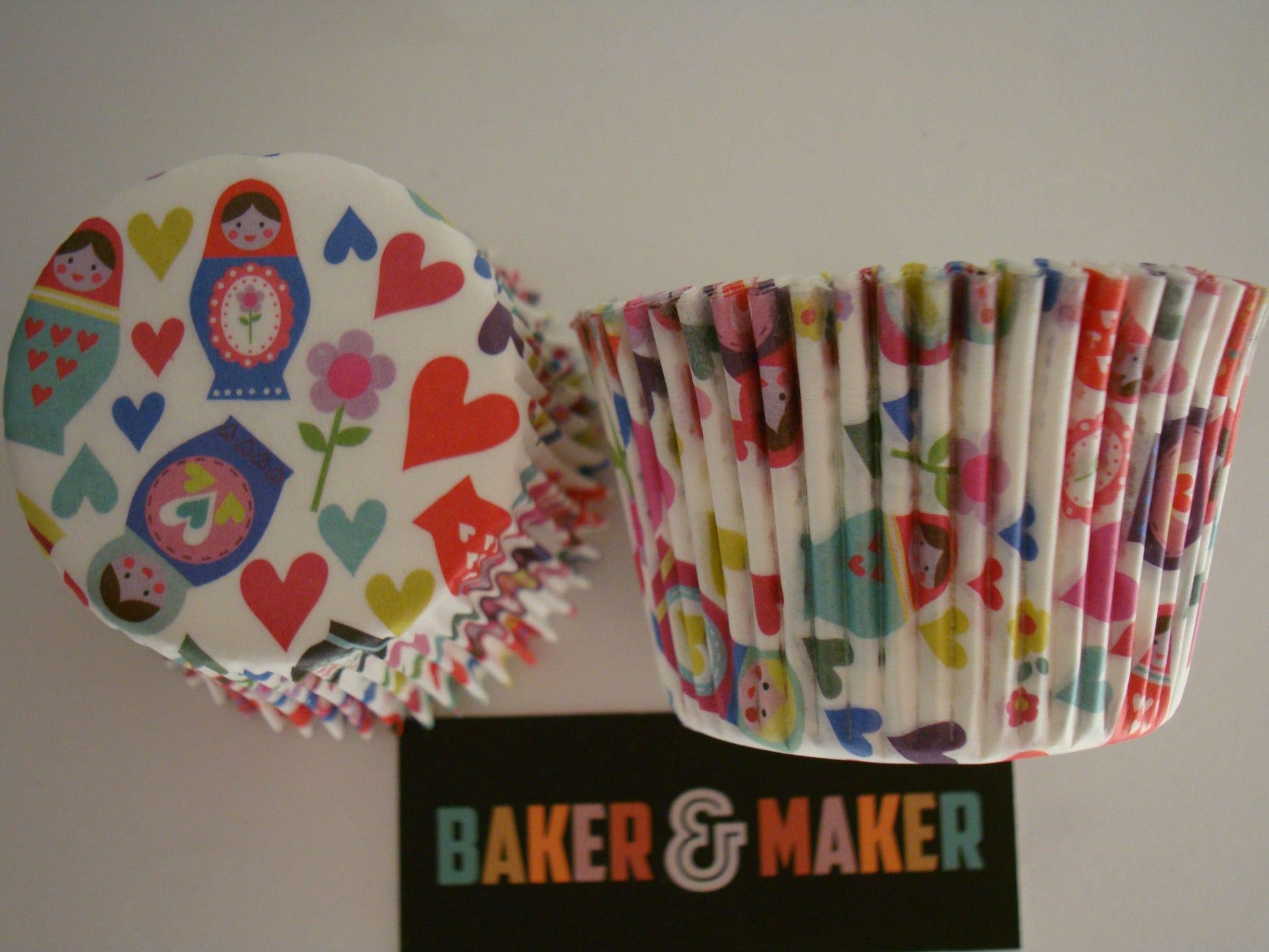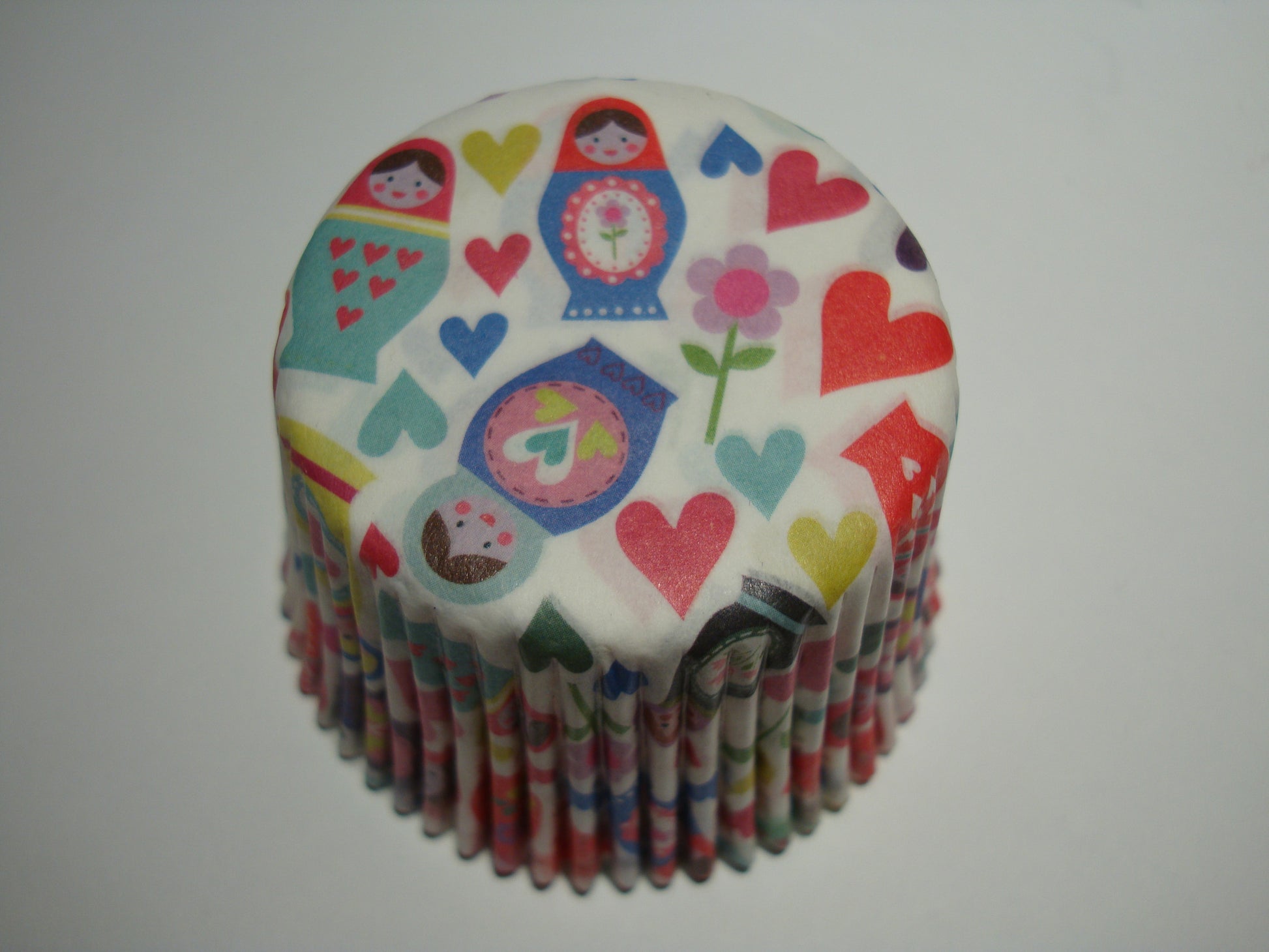 These colourful cupcake cases are white with a fresh multi-coloured design featuring Russian dolls, hearts and flowers