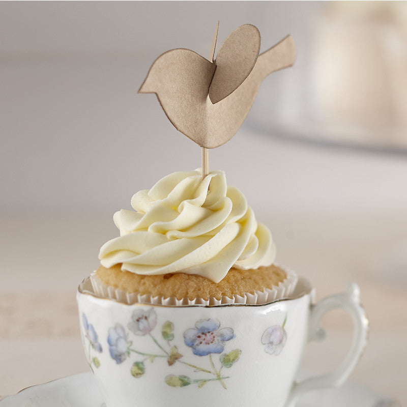 Pack of 12 sticks on stiff, textured card in the shape of a lovebird. Ideal for cupcakes, sandwiches, desserts, etc. Pull the wings out at the sides to create a lovely 3D topper.