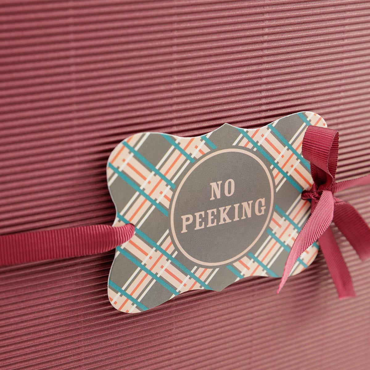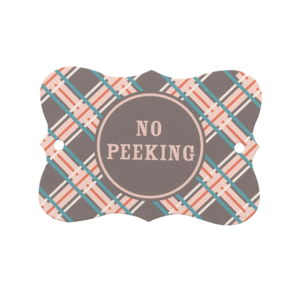 These 'No Peeking' tie on gift tags are a little different with a unique design featuring two fastening holes. Take a narrow ribbon or baker's twine to secure it to your gift or hamper. Design on one side and blank on the other for your own personal message.