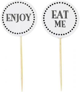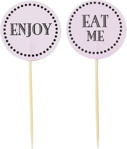 Pack of 12 fun round paper cake toppers on wooden sticks with the orders to 'Enjoy'or 'Eat Me'!