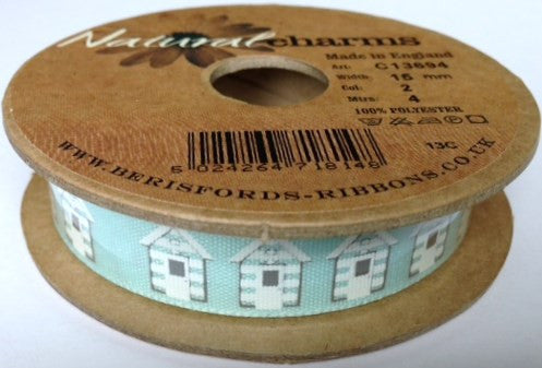Very pretty design ribbon with beach huts on a pink or blue background.