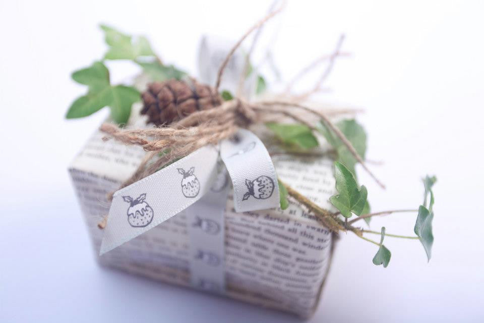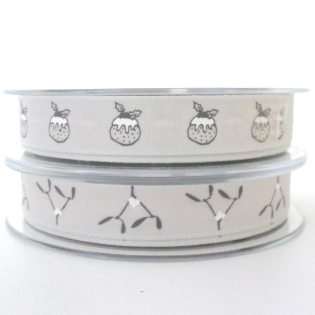 Ribbon: Christmas Mistletoe or Pudding Grey - 15mm, by the metre or 20m reel