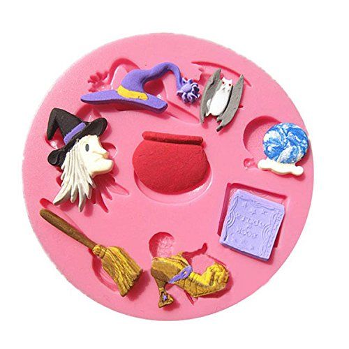 Silicone Mould: 8 motifs - Spooky Halloween Witch, Hat, Broom, Shoe, Cauldron, Bat, Spells, Crystal Ball