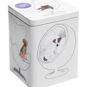 This storage tin features 5 adorable dogs seated on their favourite chair.