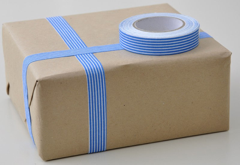 Finest quality blue seersucker style striped self adhesive fabric gift tape.
