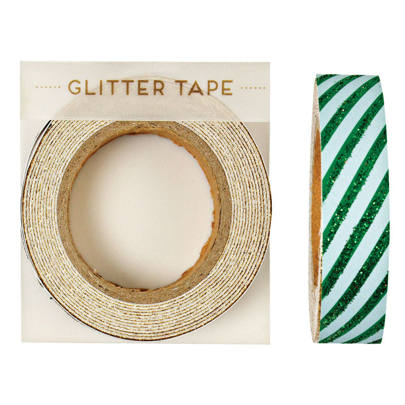 Decorative tape to add the finishing touches to your Christmas gifts. In green with a diagonal stripe and a sprinkle of glitter. Embellished with gold foil and glitter, ideal to use for present wrapping, crafting and decorating.