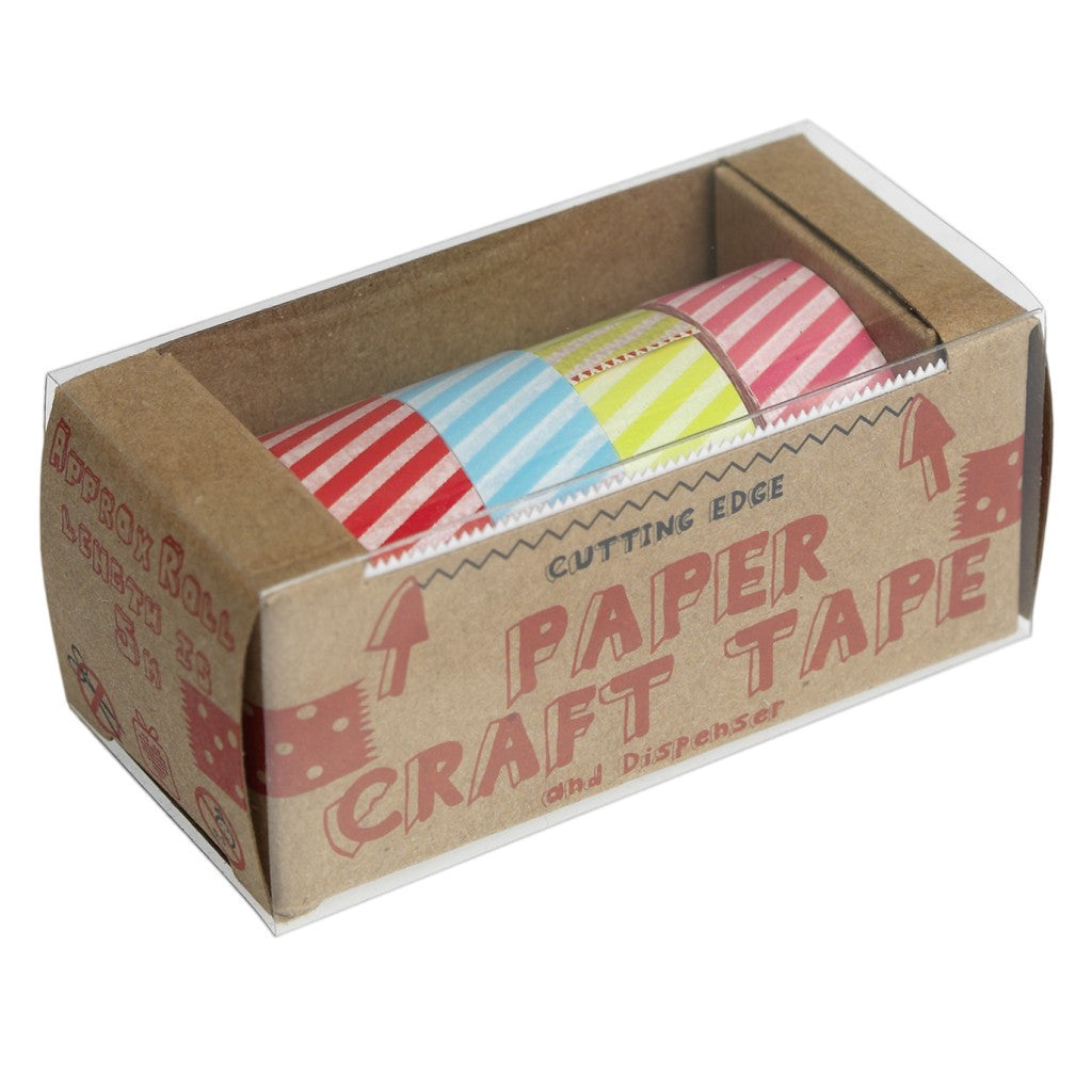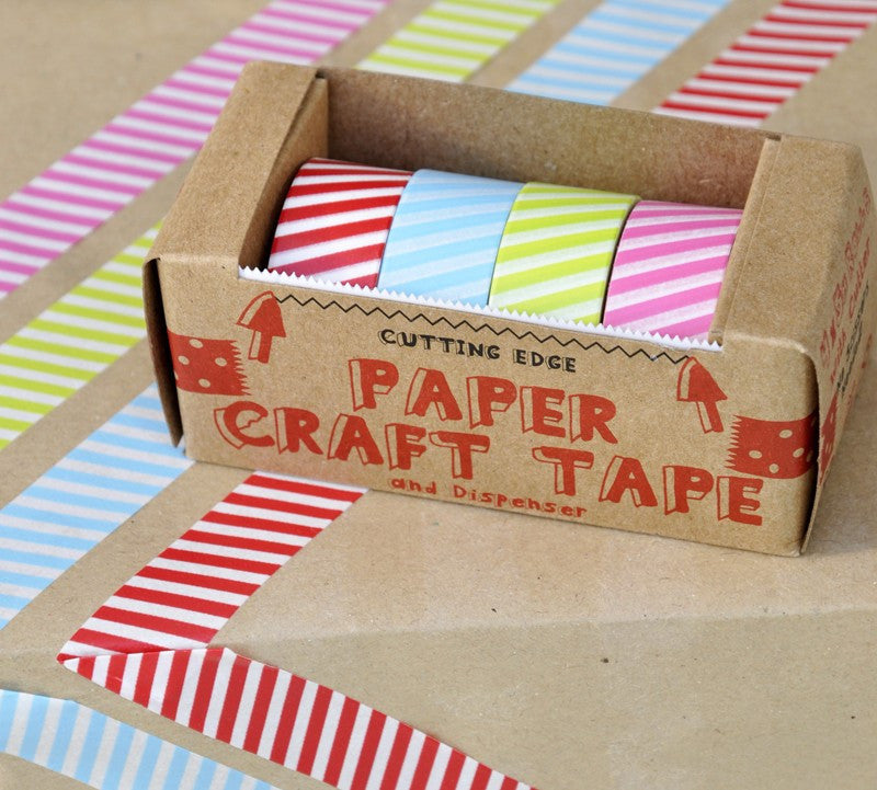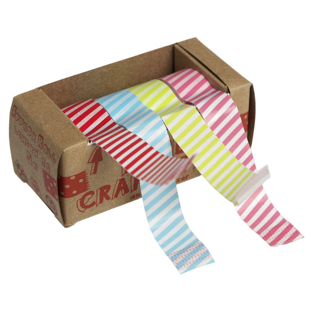 Pack of 4 candy striped paper washi style tapes, in a handy dispenser box with cutting edge so no scissors required.