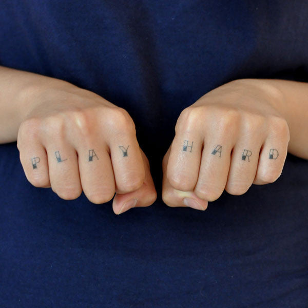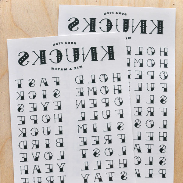 Knucks is basically a 4x6 sheet of pure gangster, but with a soft edge! Mix and match the four letter phrases to create unique statements on your knuckles. With 22 words per sheet, you can create 11 full, two hand knuckle messages with each sheet.